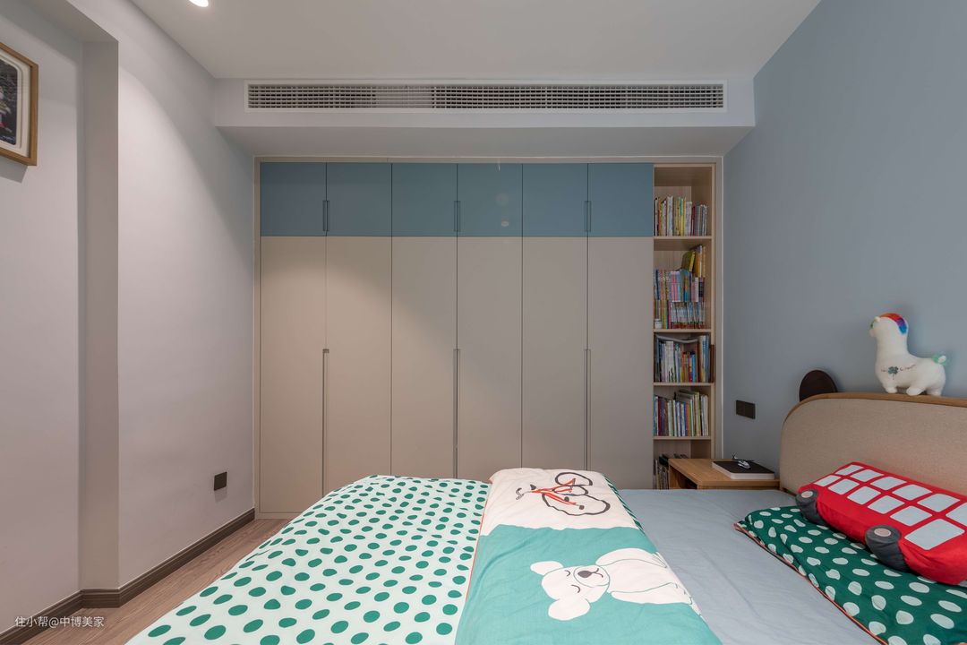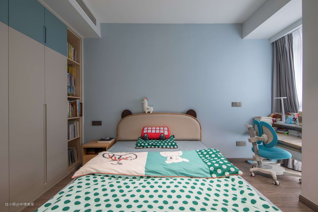墙面定制有一体的书架橱柜,书架上摆满着书籍,靠窗的一侧则放置着书桌和蓝色椅子,床位的墙面上悬挂着装饰画,为房间增添了几分精致优雅的格调感。