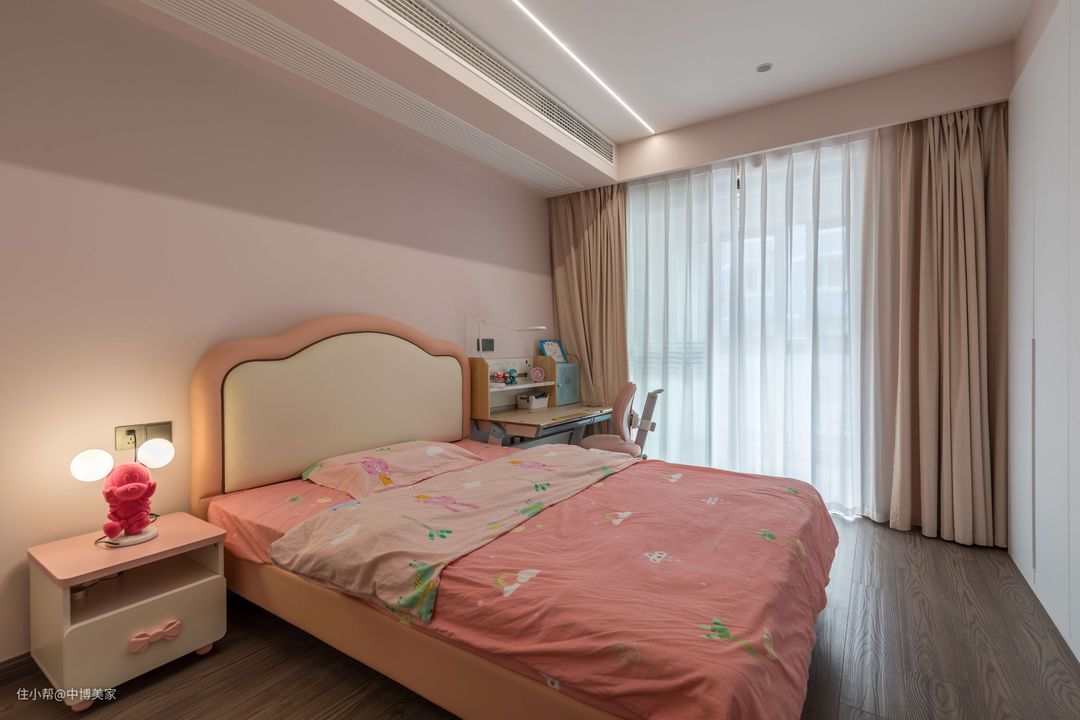 女孩房以粉色色调为主进行设计,墙体以及吊顶都涂刷粉色乳胶漆,整个空间格外温馨。