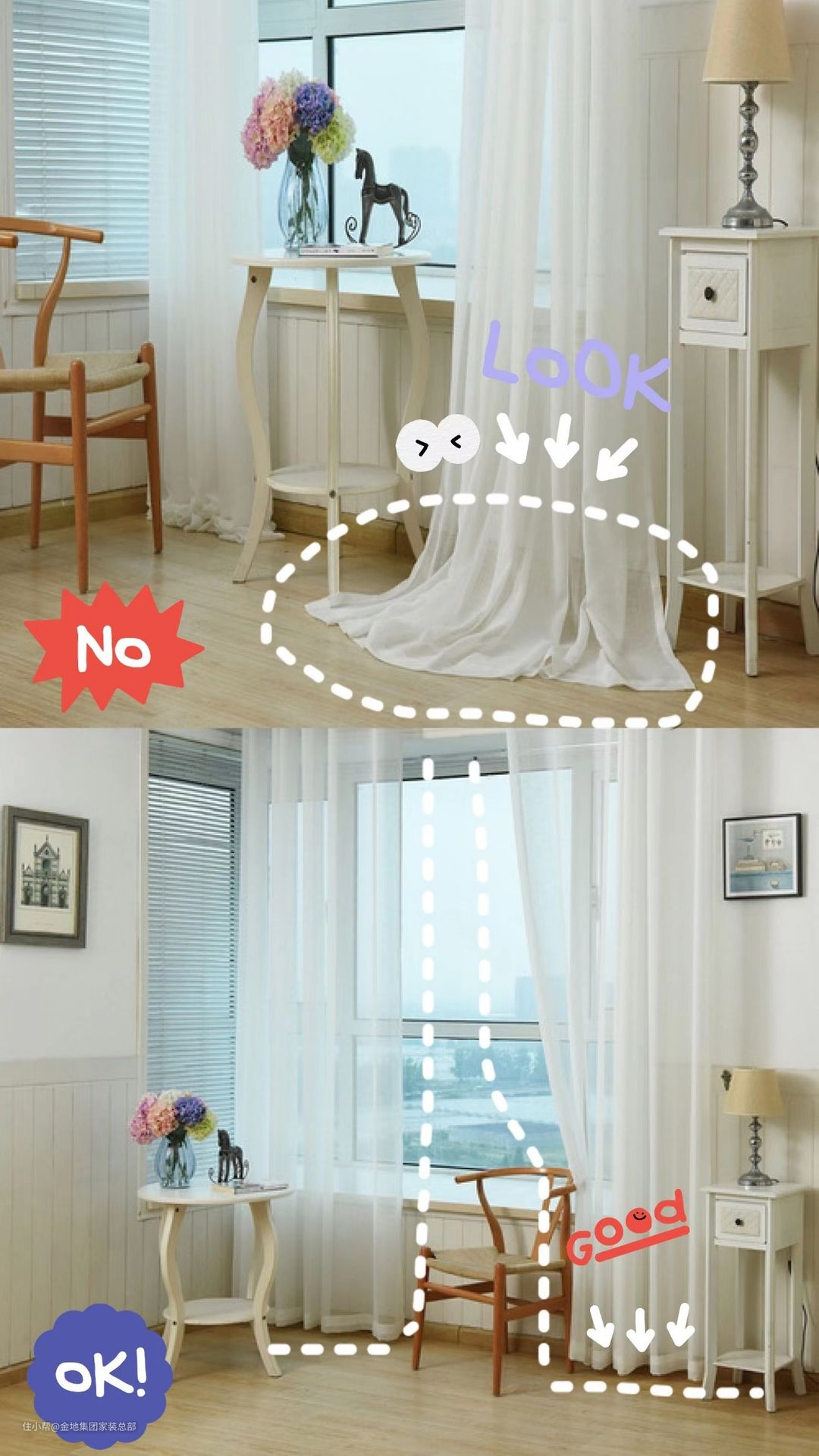 当然如果业主自身喜欢也可以选择垂地的窗帘,只不过这样设计虽然能够拉长视觉效果,但是会有一定的“累赘感”,同时垂地会堆积很多地面灰尘,动线密集区可能还会踩上两脚,窗帘很容易灰扑扑的。