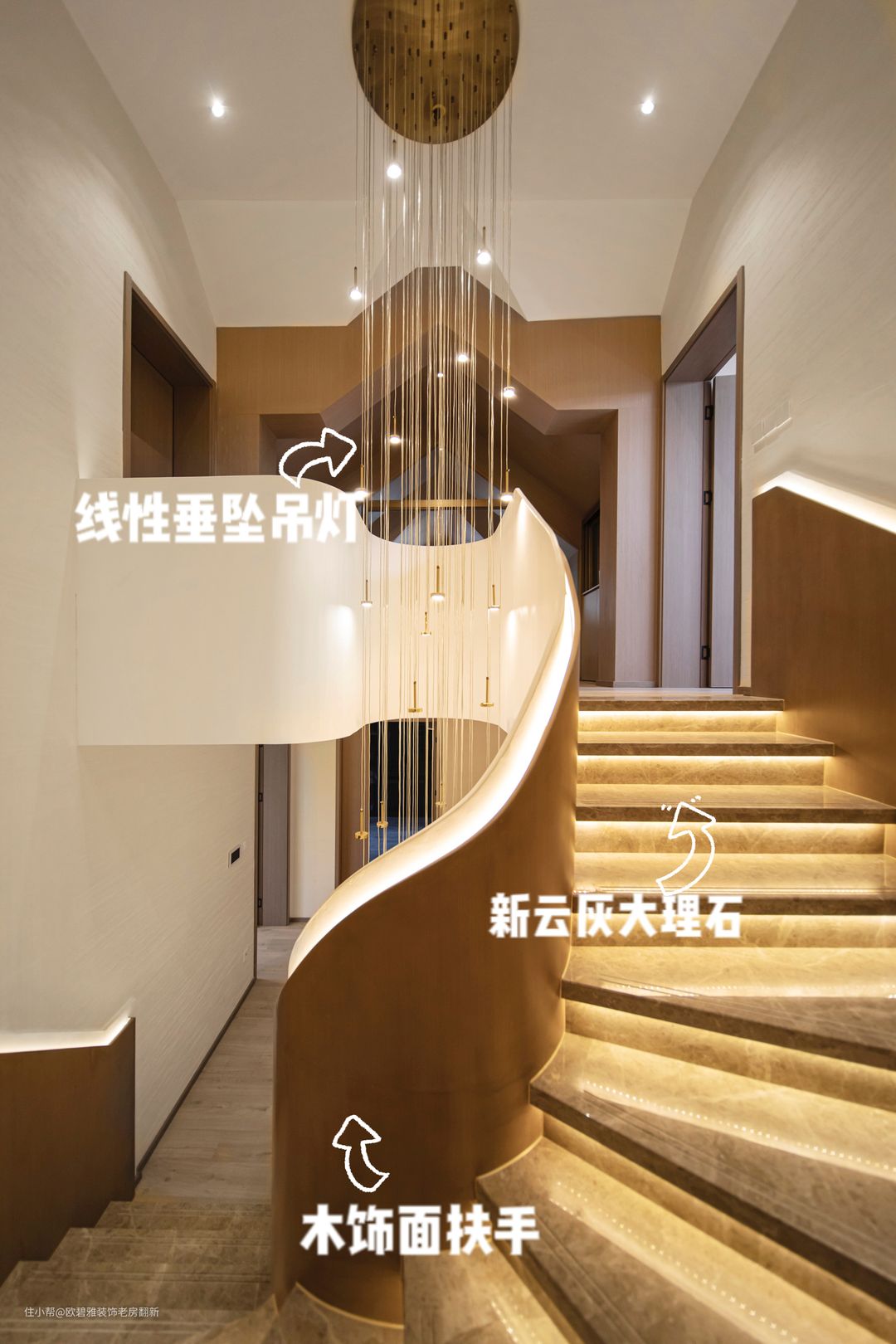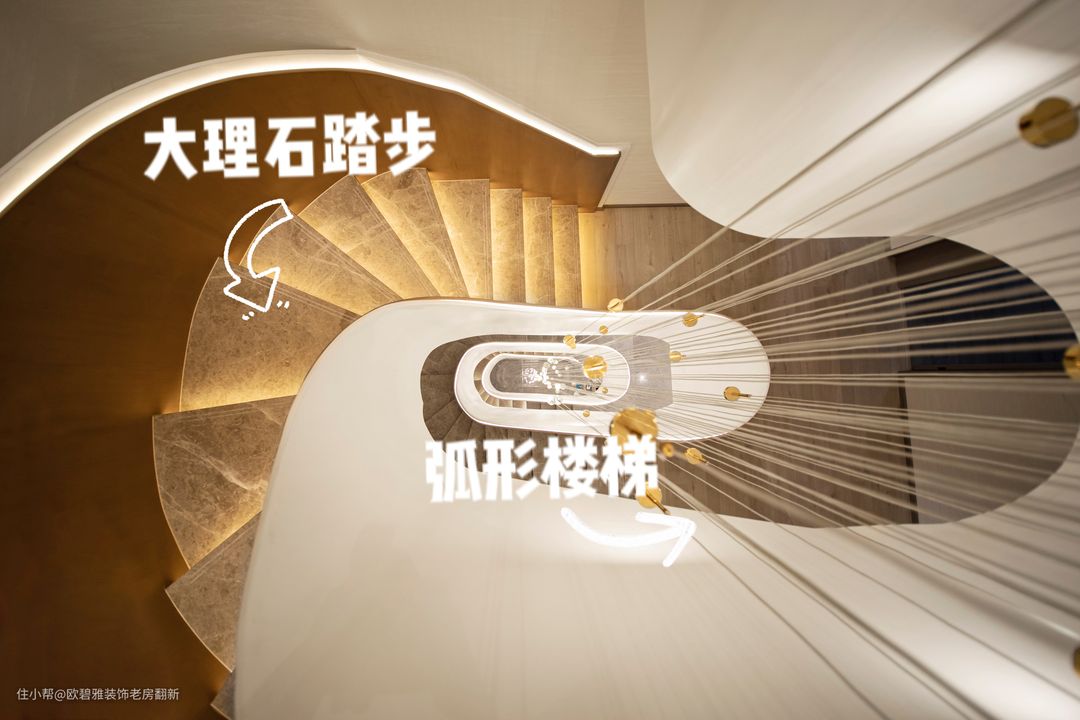 舒适感极强的大理石条踏步&弧形楼梯氛围感强烈,瓷砖新云灰大理石