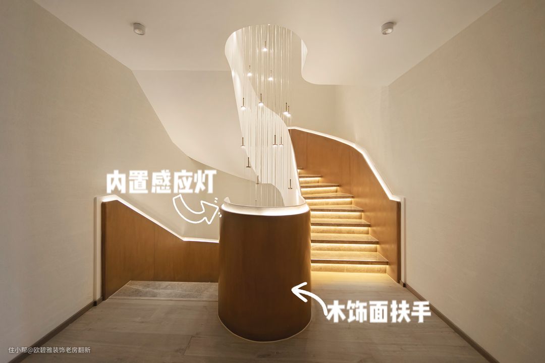 内侧扶手木饰面&外侧白色油漆&中间内藏感应灯带,楼梯高度15公分,宽度30公分