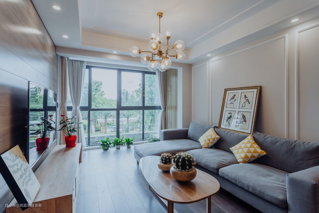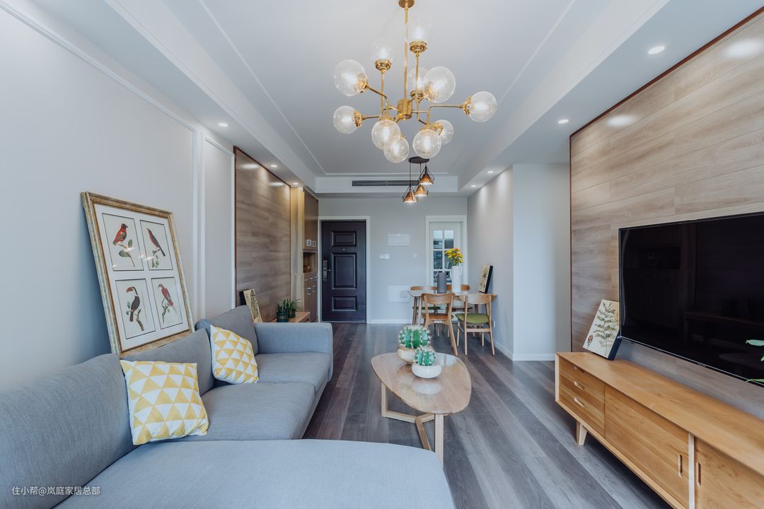 沙发背景墙是用的大面积乳胶漆搭配石膏线图案。2.8米的三人沙发,柔软舒适度满分,高级灰的配色既耐脏又能完美搭配空间色彩。