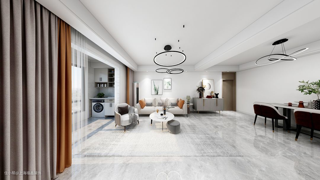 【客厅】客厅与阳台相通,外界的光线便畅通无阻地进入了室内。夜里,环形的吊灯就替代日光提供照明。原木饰面板拼接白色护墙板,浅色之间的渐进也富有层次感。