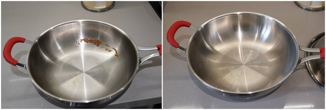 ▲首先在餐具满载情况下挑出两个比较有说服力的污渍:炒锅干结污渍和火锅汤锅。使用灶具洗模式,效果如上图所示。
