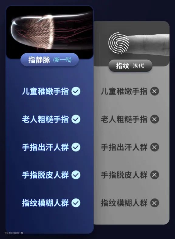 这种方式可以平替指纹识别,由于是利用红外光直接采集手指皮下的指静脉特征,所以识别体验完全不受手指外部因素干扰,而且血管图样也不容易随着年龄的变化发生改变,适用的人群更广。