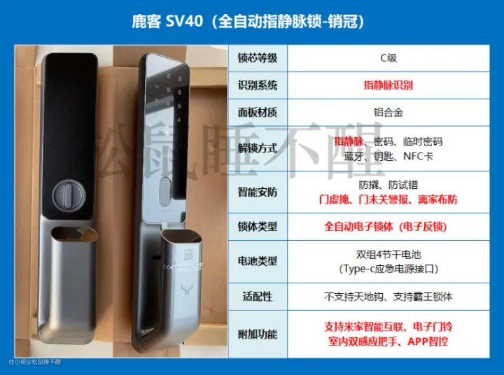 “鹿客”是指静脉识别领域的翘楚品牌,“SV40”又是同品类销量最高、细节做的最好的一款。指静脉识别突破了年龄限制、不会随着年龄而变化,也无惧手指外部因素干扰,是解决指纹识别困难的最佳方案。