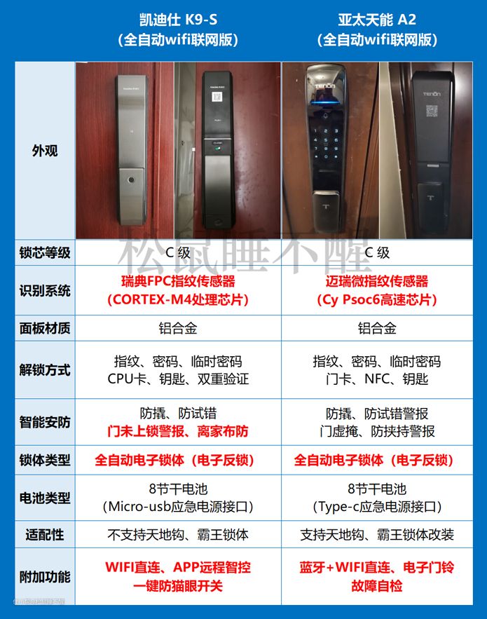 “凯迪仕 K9-S”和“亚太天能 A2”都是常规全自动锁里功能设计比较精简的型号,一路以来都是以稳定性著称,光是“全自动电子锁体”和“指纹系统”的优势,在体验上就已经秒杀了很多同价位其他产品了。