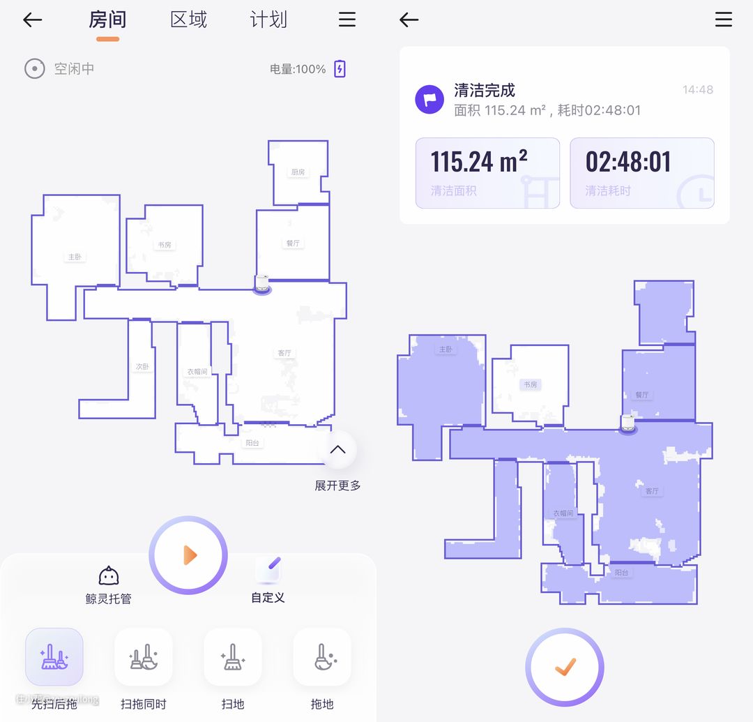 日常使用界面比较的简洁,日常家里的维护基本只需要选择“精灵托管”即可,可以选择要托管的房间,不选择则是全屋托管。当然你也可以选择自定义清洁,云鲸J3支持先扫后拖、扫拖同时、纯扫地和纯拖地四种模式,并且支持选择扫次数以及力度。