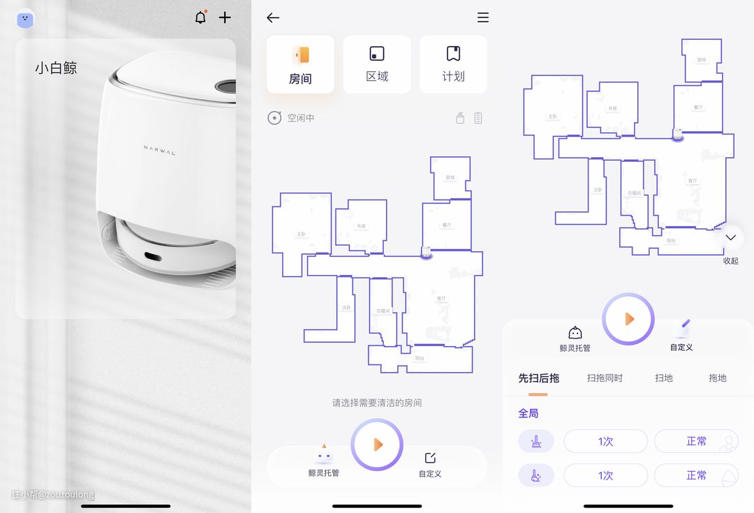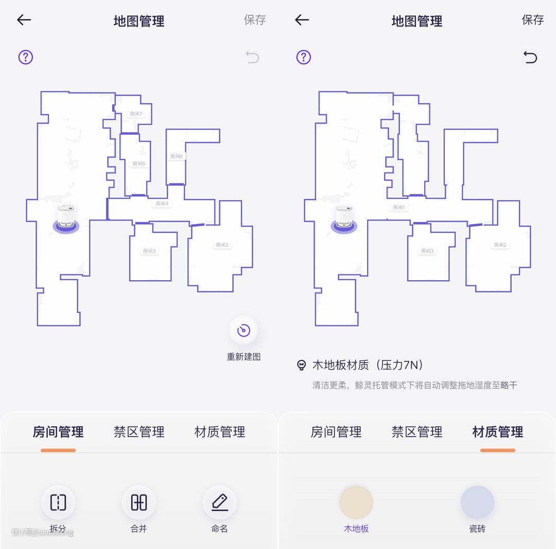 地图是支持房间、禁区和材质管理的,比如像我家阳台厨房是瓷砖,其余全是木地板通铺,地板材质的管理,通过下压力的变化实现瓷砖更好的清洁效果,也能很好的保护地板。不过目前暂不支持多个地图的管理,像跃层、别墅等户型云鲸只能清洁一层。