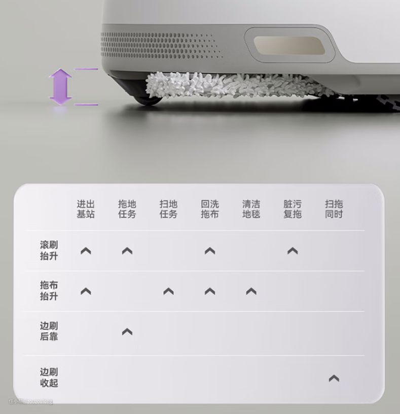 可见机器人已经变成一个扫拖一体的机器人,不再像之前那样需要手动更换扫地、拖地的模块。并且加强了清扫地面的能力,不仅加入了带刷毛的主滚刷,大大的提高地板缝隙的清洁能力,并配合高达3000pa的吸力,相比前代有较大的变化,而且主刷还支持主动抬升,让对应模式清洁效果更好,也能有效避免对地面造成二次污染。