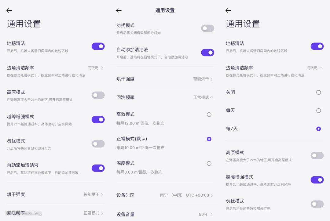 详细的设置里面你可以个性化的选择或调节地毯清洁、边角清洁频率、越障增强、烘干强度、回洗频率等功能,功能比较的齐全,目前使用下来没发现什么缺失的功能。