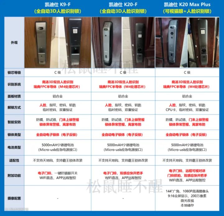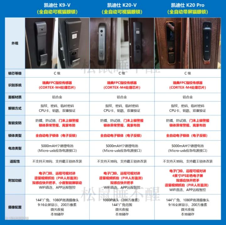 猫眼锁主要有“远程可视”和“室内带屏”两种特色功能,基础配置延续了“K9系列”和“K20系列”的底子,这三款的摄像头配置也差不多。