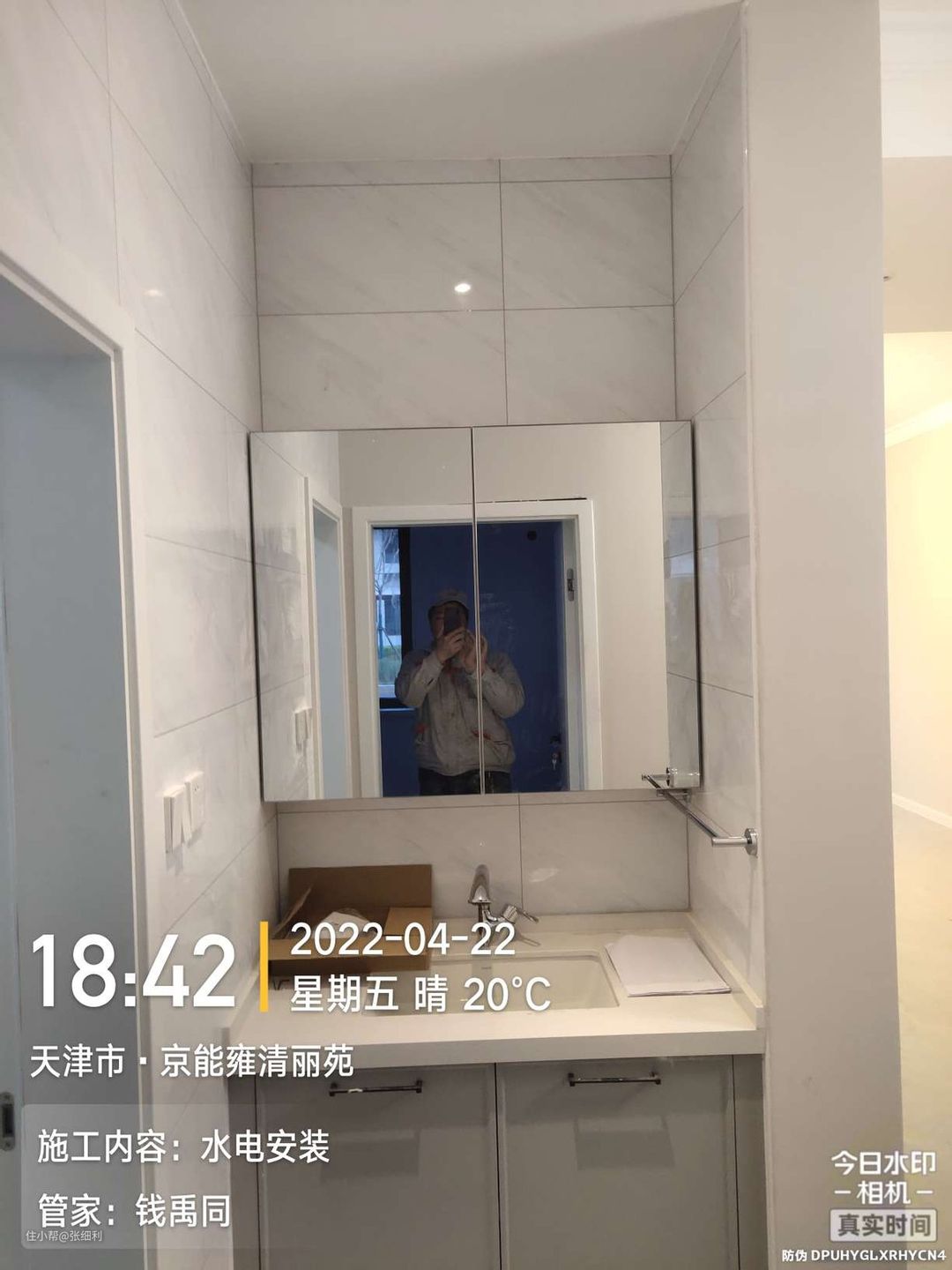 干湿分离空间,一般干区位置比较狭小,选择浅色瓷砖,浅色浴室柜提升空间亮度,提升视觉通透感。