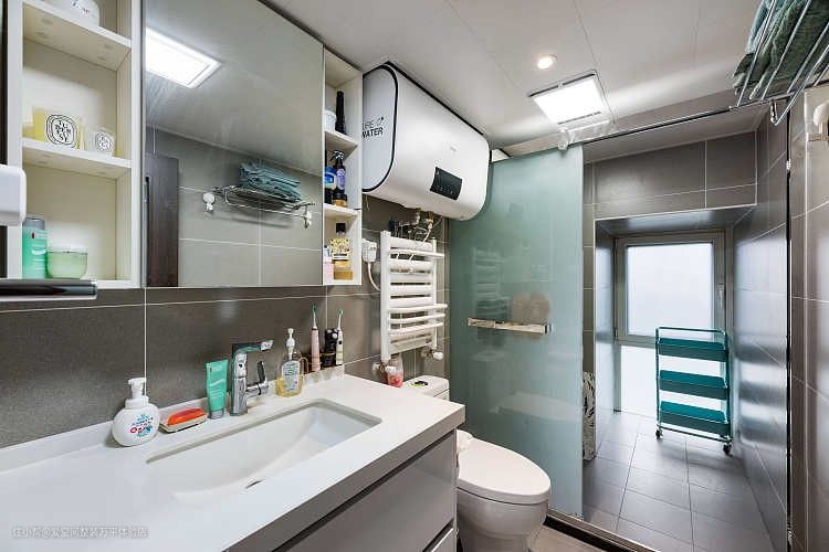 卫生间充分利用了墙面空间,减少收纳压力,纸巾盒粘到浴室柜侧面,就在马桶旁边,使用起来更方便。马桶上方空间也没有浪费,电热毛巾架、热水器把墙面空间都利用了起来。