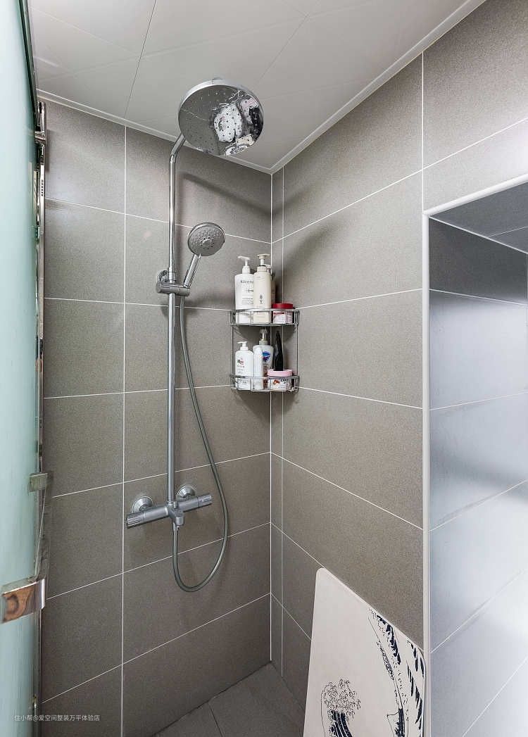淋浴区使用哑光灰色长方形砖上墙,卫生间给人一种沉稳大气感。墙角放墙上置物架,放一下沐浴用品使用起来很方便。
