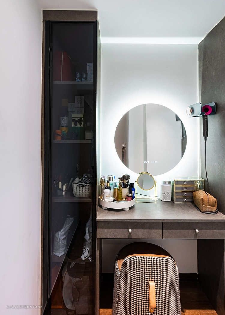 梳妆台两边是通顶高柜,柜门采用黑色玻璃,高级又大气,深灰色梳妆台,精致与尊贵由内而外散发,合理规划储物收纳更清晰,精心选择的台面置物架,旋转使用超级方便。圆形化妆镜嵌灯带提升氛围感。