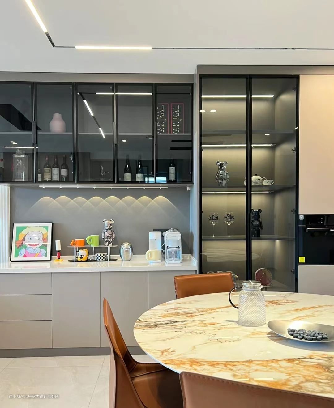 餐边柜做隐藏灯带是好看,但要客槽、埋线,不管是预算还是施工时间都会拉长,而且如果找的人不专业,灯带位置没选好,施工结果是什么样也不敢保证。如果实在是喜欢这种效果的话,我的建议是可以后期用粘贴式灯带做补救。给中空处贴一个就行,感应的。有人过来了自动就亮了,倒水冲咖啡也不用黑漆漆的。