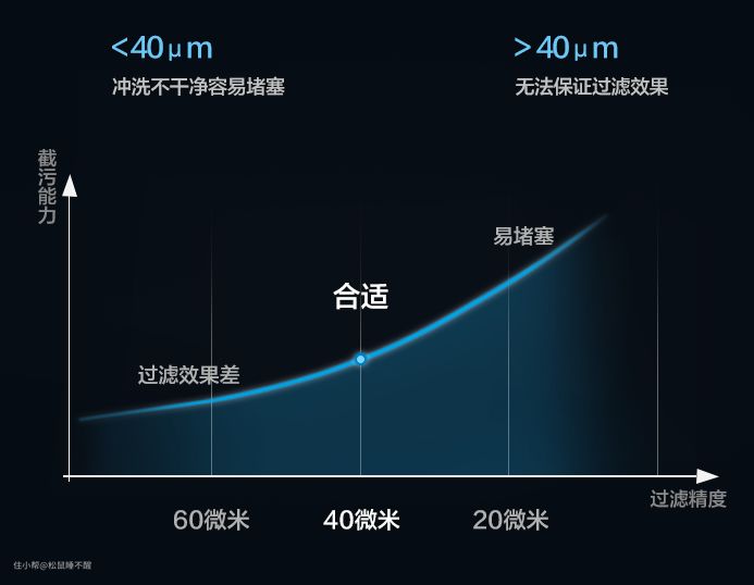 至于主流精度为什么是40微米,也很好理解,40微米刚好是肉眼可及颗粒物大小的临界点,过小容易造成堵塞,像早期产品孔径都在60-100微米,拦截效果不佳,适合绿化园林灌溉的要求,但不能满足日常家用要求,所以慢慢淘汰了。