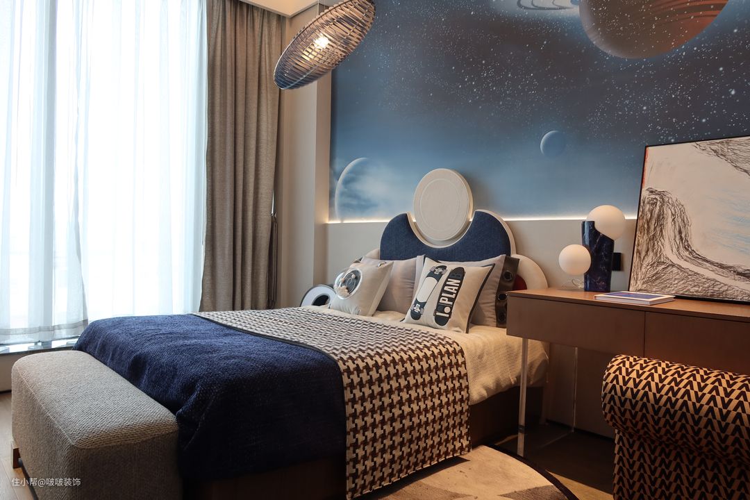 很有范儿哦,功能齐全的儿童房间,充满未来感的房间。探索浩瀚宇宙,对未来对科学充满向往,从小要热爱学习,激发好奇心。 背景墙就是以星球,宇宙图案为主题,星星闪闪。定制书桌,书架,以及床等都恰如其分,兼顾美观与使用,并且符合业主儿子的爱好。