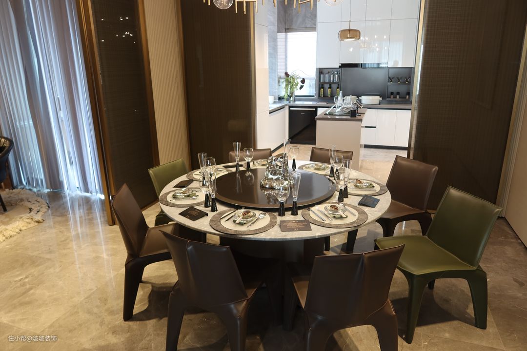 已玄关为分界,区分客厅与餐厅,是一个仪式感满满的设计。尤其有亲朋好友来相聚的时候,非常提升调调。玄关往右又是一个独立空间,是餐厅。餐厅与厨房打通,显得空间够大,实际上也可以摆放下一张8人用餐的圆桌,让吃饭都有仪式感。俯瞰加上轻奢系列的吊灯,满满的高颜值颜值餐厅。
