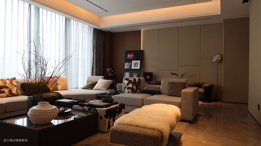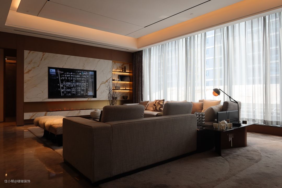 客厅电视背景墙放一块大理石,内嵌式的电视机。地砖选用哑光,在这个开阔的空间下,显得低调又高级,显现出主人的稳重。悬浮式的吊顶,全屋无主灯设计围绕轻奢的主题。