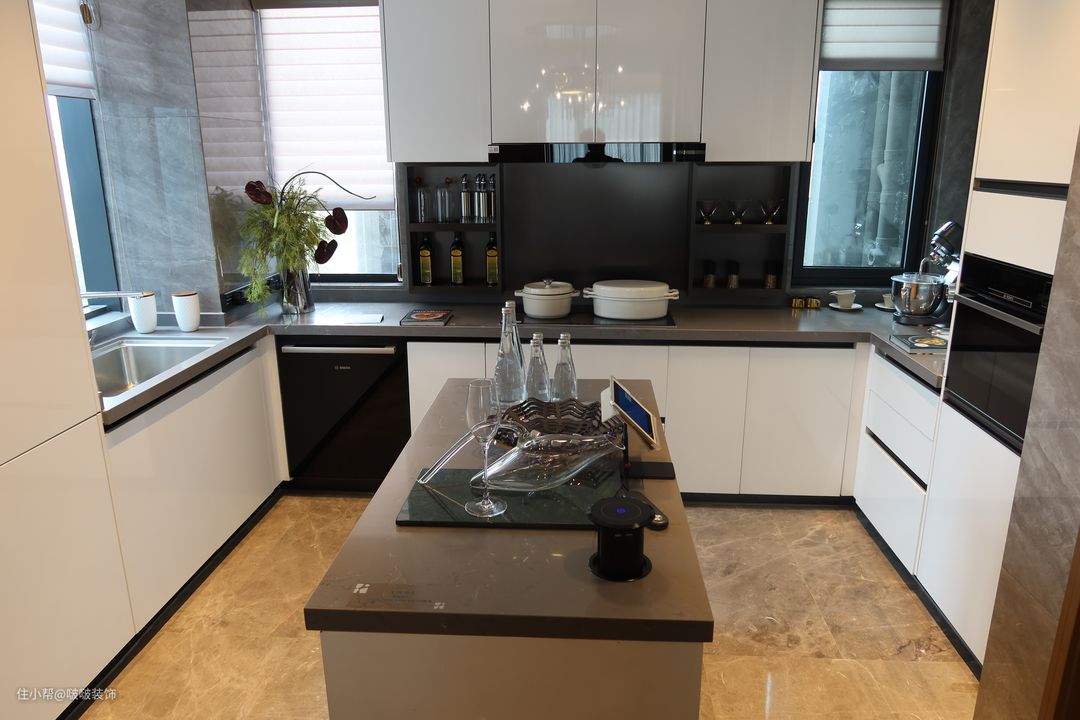 厨房空间足够大,大了有点浪费的感觉。所以设计师就匠心的在中间设立了一个导台,可谓是点睛之笔,实用又高级。白色的柜体与深灰的岩板组合,大气敞亮。白色为主色调的厨房,适合这个面积足够大的厨房,另外也显示出了主人的高贵。