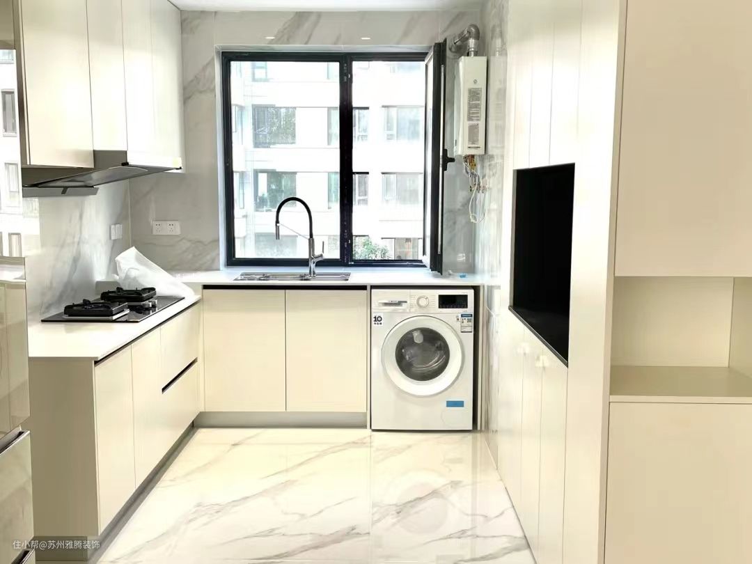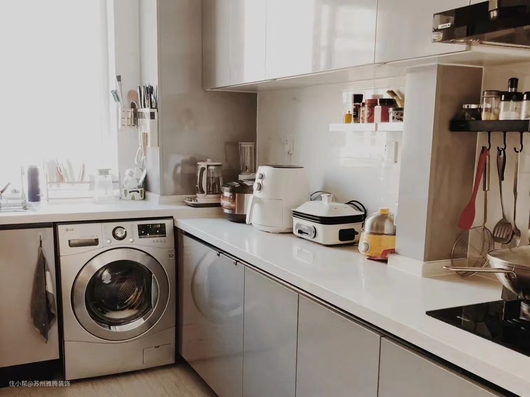 其实对于大户型的厨房有多余的空间来放洗衣机也是可以的,但是如果长时间做饭,难免洗衣机上会沾上油污,而且还降低了电器的使用寿命。这种方式比较适合习惯吃生冷实物,不怎么开火的家庭。