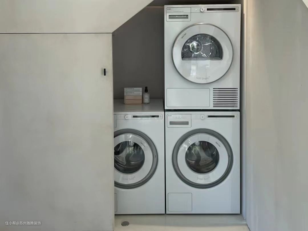 如果楼梯间面积足够的话,不仅可以将洗衣机嵌入进去,还可以制作储物柜,增加收纳。