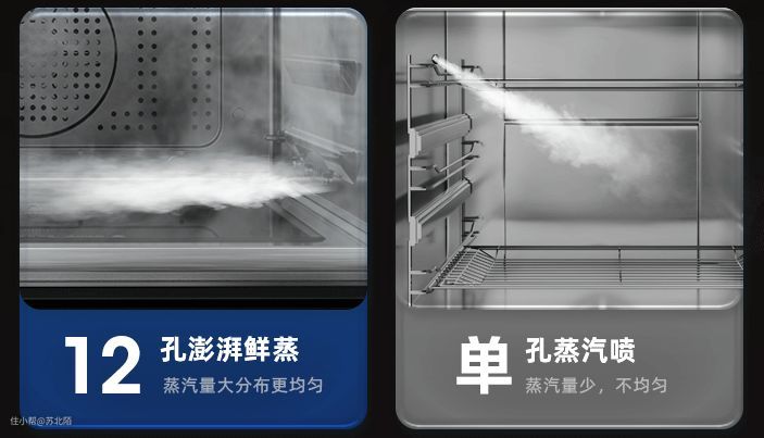 市面上很多这个价位的型号都是“单孔”或“双孔蒸汽”,没有风气带动,功率也没这么高,在锁鲜效果上就要差一些,另外靠近蒸汽孔的地方火候不好控制。