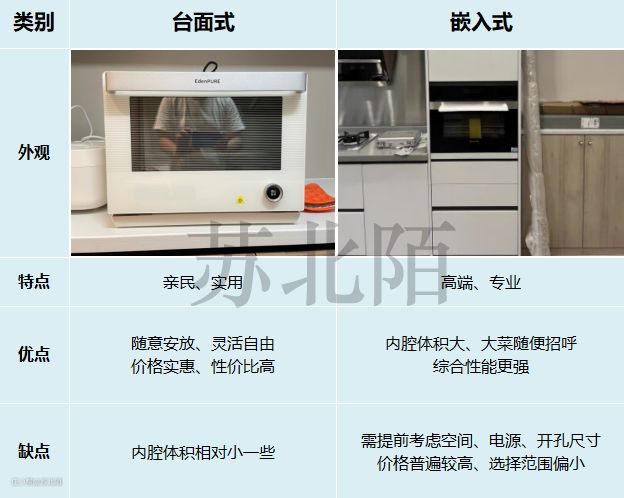 “台式机”的适用范围就更广,不限位置、不用安装,以一敌三,但是像1-2K的微蒸烤机很多功能和闹着玩差不多,不如“蒸箱、烤箱”分开好用,更像是个贵一点的微波炉。