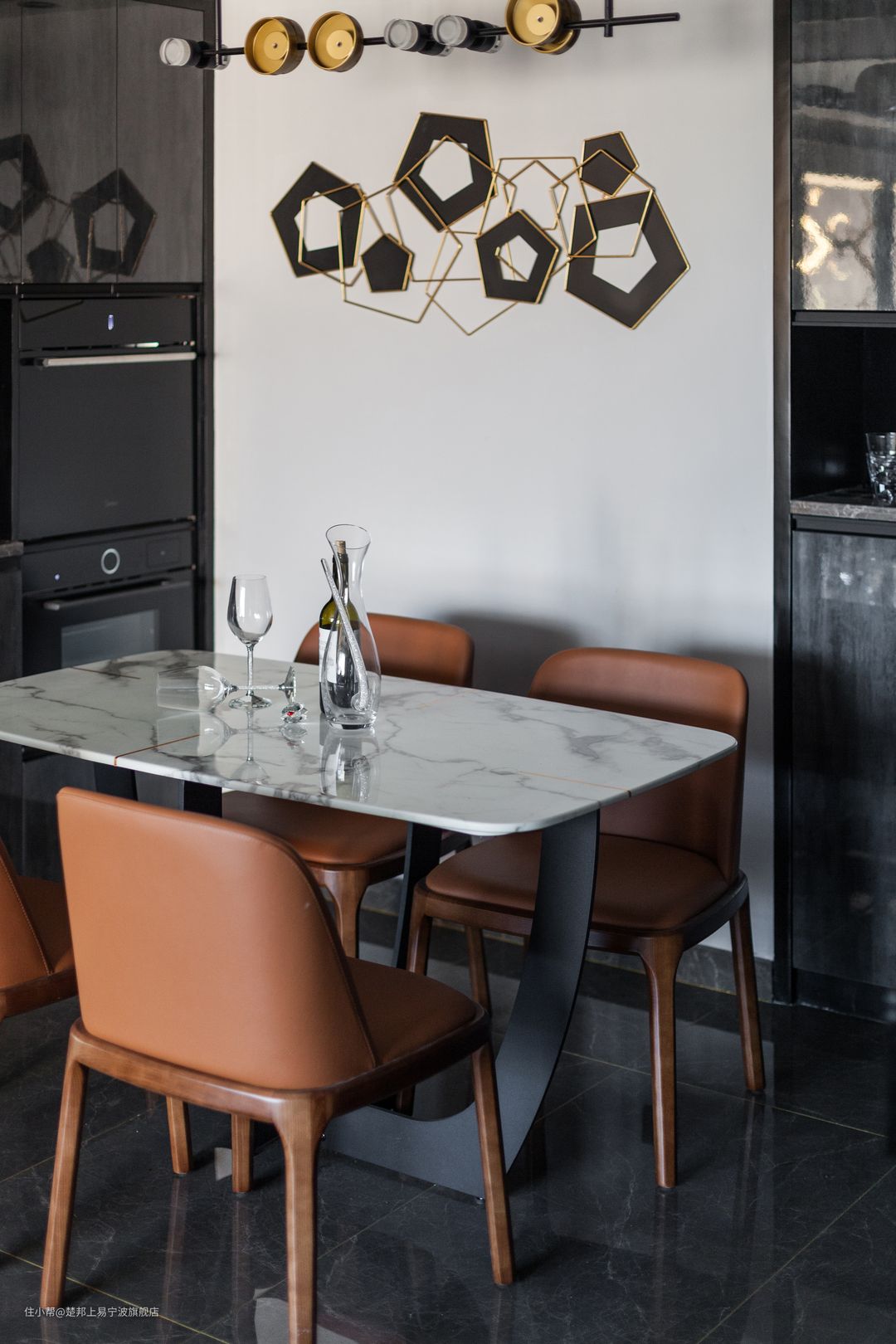 墙上五边形拼接而成的装饰图案,既有金属质感,又有一种线性美。