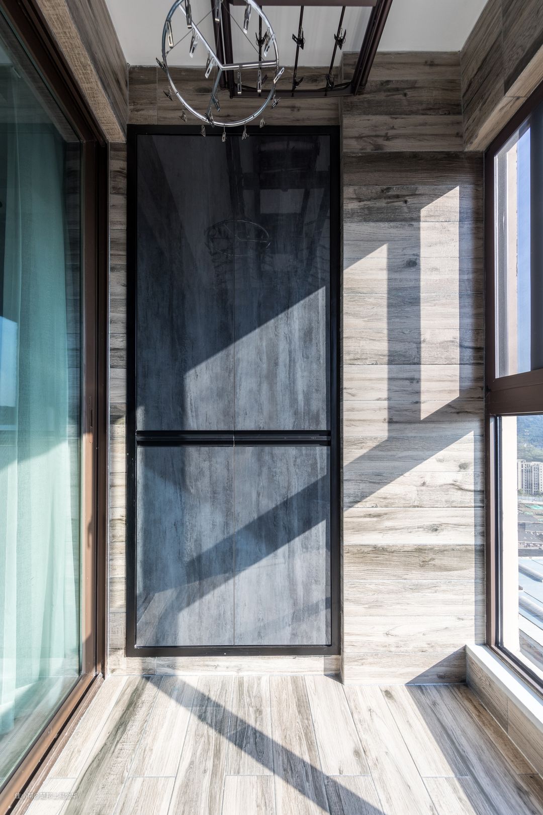采用的瓷砖非常像木板,并且大面积的使用,整个阳台非常有质感,大面积的落地窗,晾晒衣服非常方便,还有自动晾衣架,简直就是懒人星的福利。利用深浅不一的瓷砖将柜子和墙壁区分开来,富有设计感。