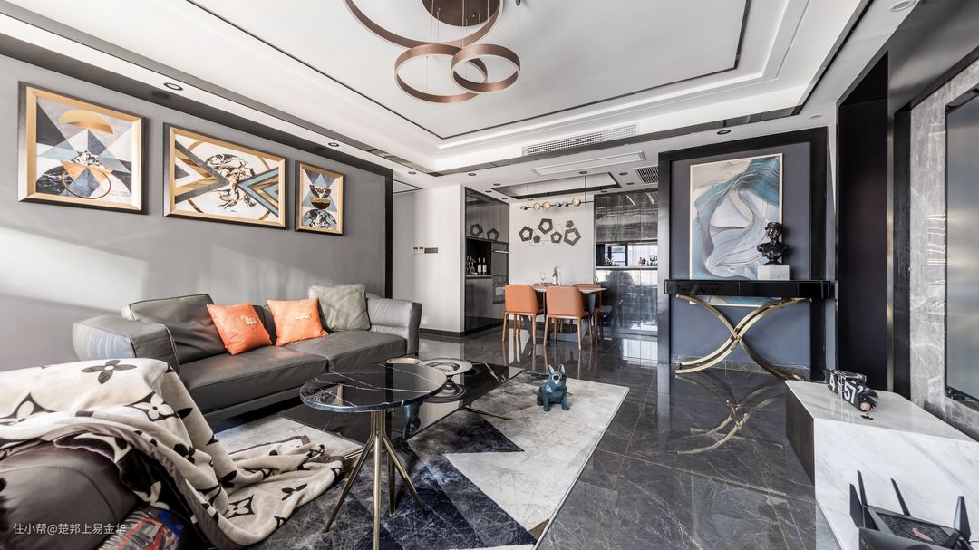 整体色调以深灰色为主,点缀橙色,延续客厅色彩,简约大气,橙色视觉上很吸睛。