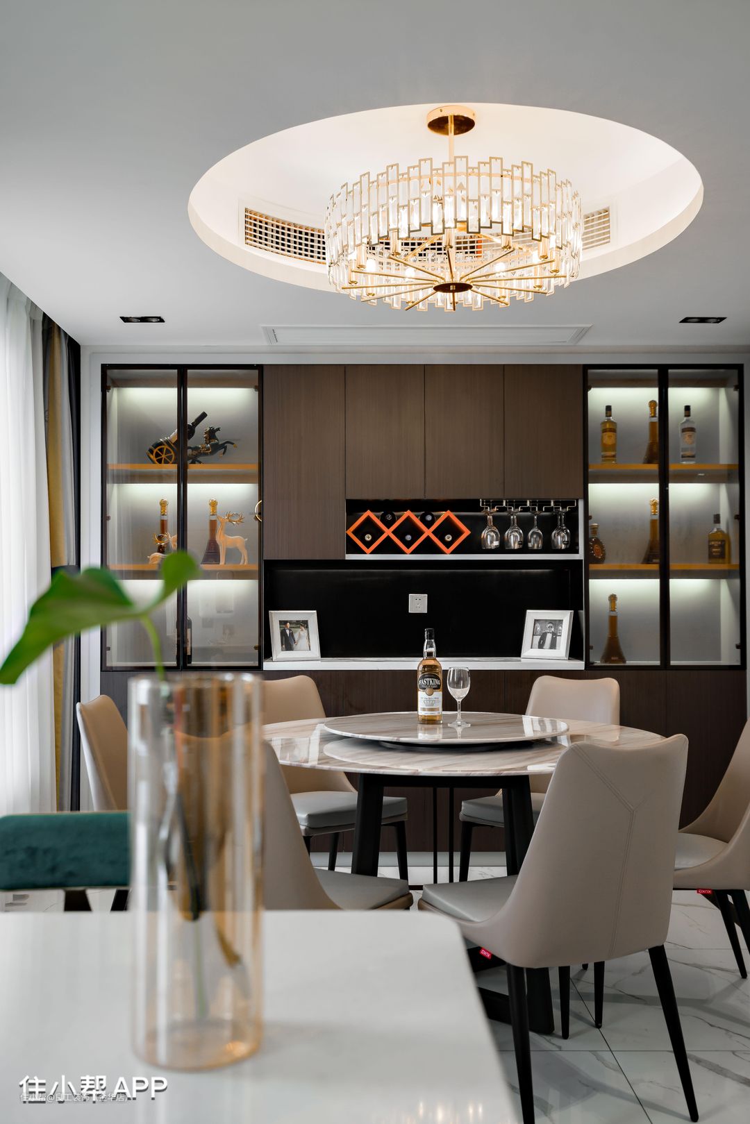 一整面墙的定制式酒柜是玻璃与柜门相结合的,融合了收纳与展示功能,灯带的嵌入让各式藏酒和漂亮摆件仿佛镀上了柔和的滤镜,赋予空间摩登都市生活质感。
