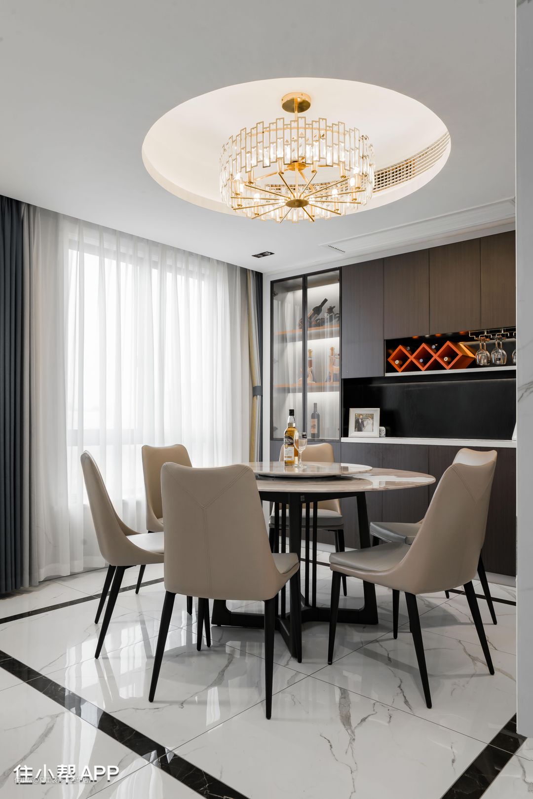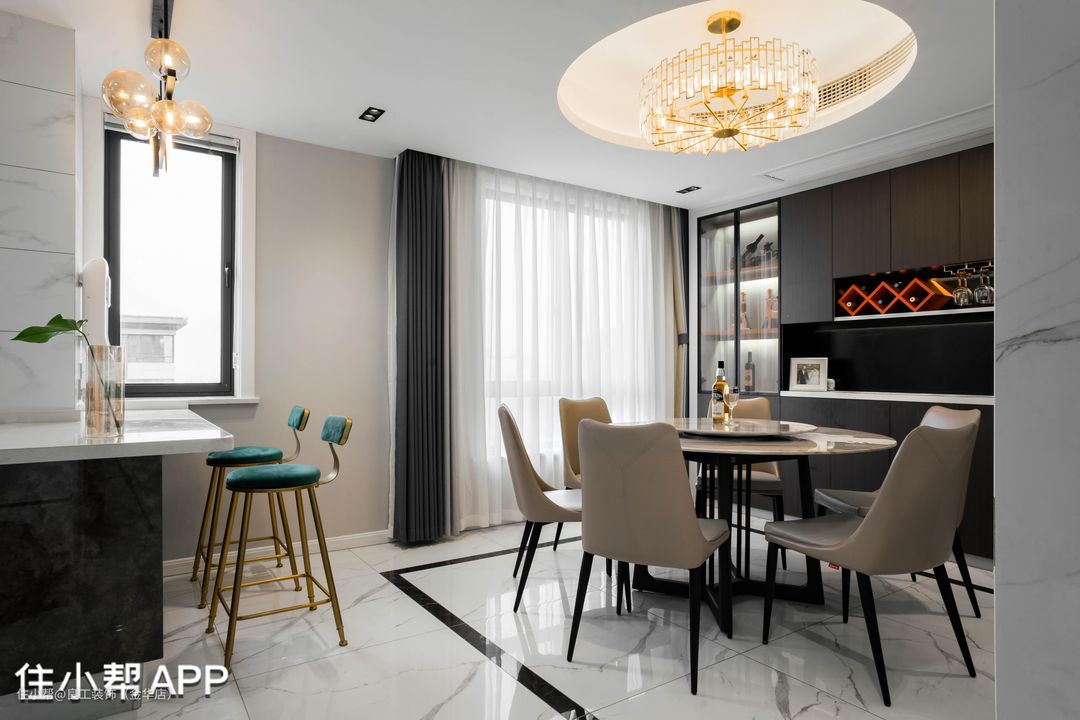 餐厅由北面小次卧打通改造而成,圆桌更能聚拢人气,与顶面的圆形吊灯形成呼应,相得益彰。