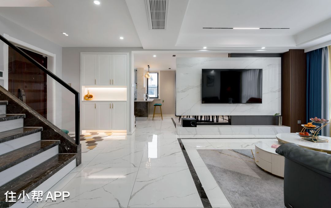 因此打薄了左侧的实墙,嵌入一组白色柜体,并在中间和底部装上感应式灯带,打造迎宾式的居家体验。