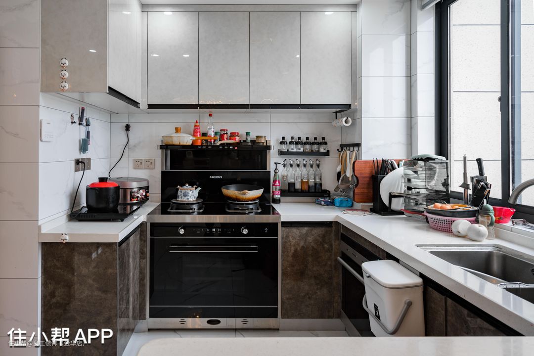 U型厨房布局紧凑,三面环形的台面实用美观,洗涤区、烹饪区及储藏区划分明确,人性化动线无缝衔接,“取、洗、切、炒”一气呵成,方寸之间营造出幸福厨房协奏曲。
