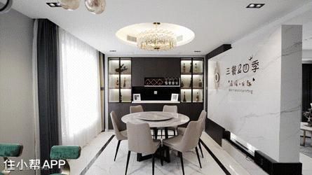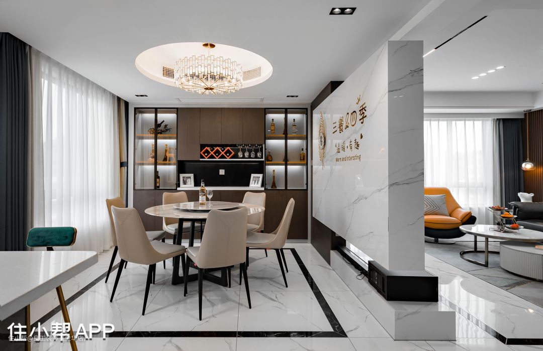电视背景墙的另一面作为了餐厅的背景墙,“三餐四季,温暖有趣”,金属字体与温润岩板相得益彰,打破空间单一感,为家注入灵动特性,也表达了居者对于美好生活的无限向往。