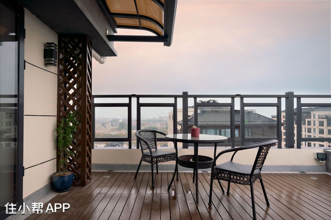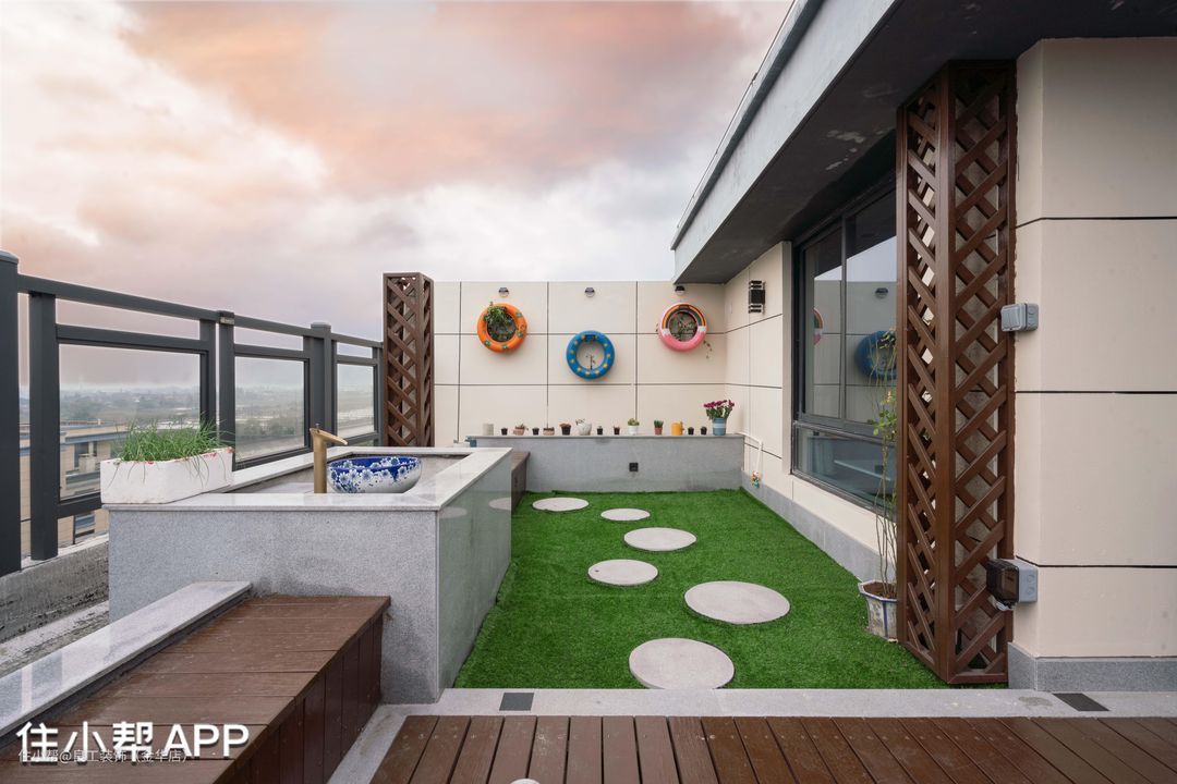 户外露台经过有序布置后,合理规划出草坪区和休闲区,变成了集休闲娱乐为一体的户外庭院,喝茶赏景,闲看落日余晖,近看朝花夕拾。