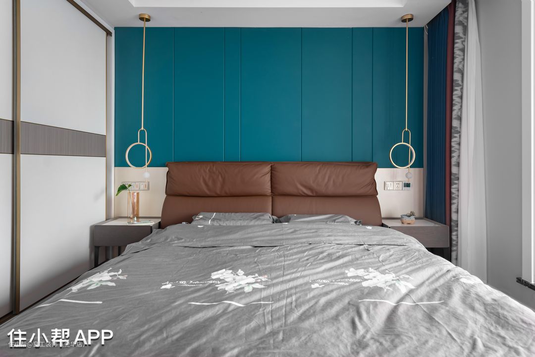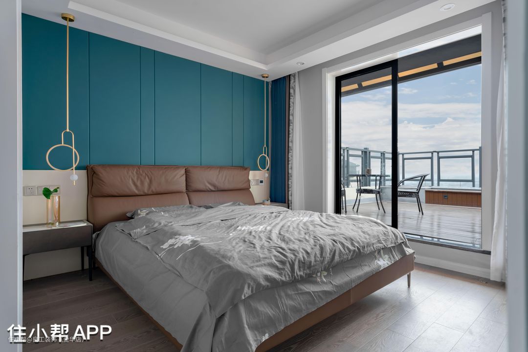 设计师引景入室,将卧室背景墙打造成静谧蓝调,与室外的蓝天白云仿佛融为一体,颇具民宿风尚,身居其中,身心充满了休闲舒畅感。