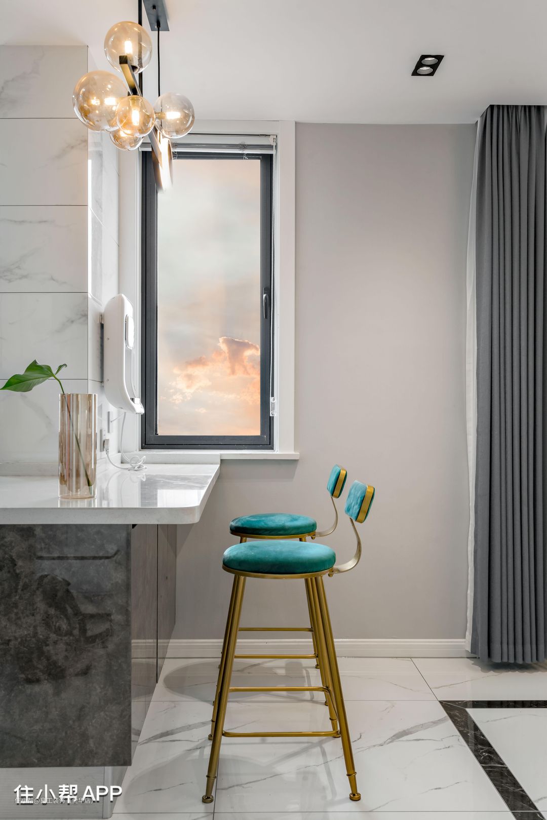餐厅和厨房被打造成开放形式,形成更强的空间流通性与互动感,两个区域中间以一个吧台作为软隔断,丰富了餐厨空间的功能,也为家注入了浪漫小资的氛围感。