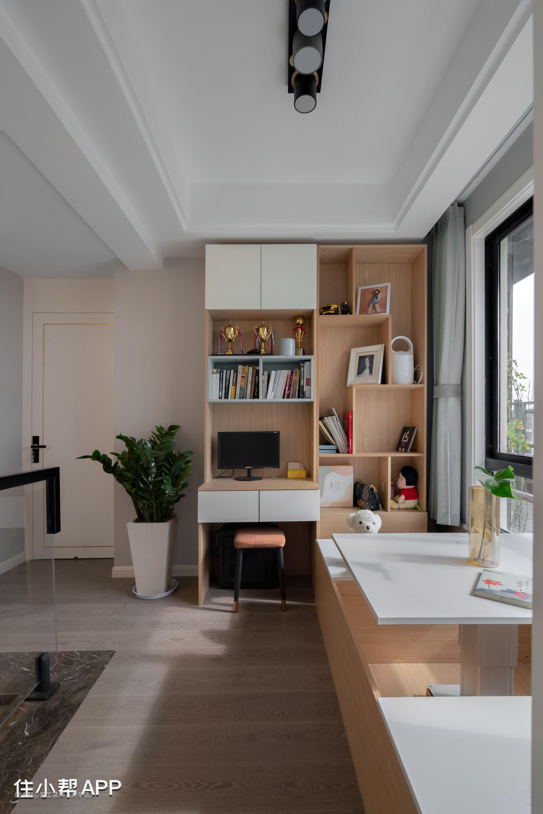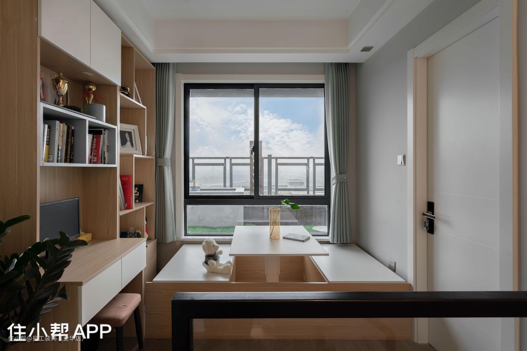 楼梯处的区域设计成了开放式书房,木色与白色组合的书房家具在阳光下释放出了岁月静好的温柔气韵。