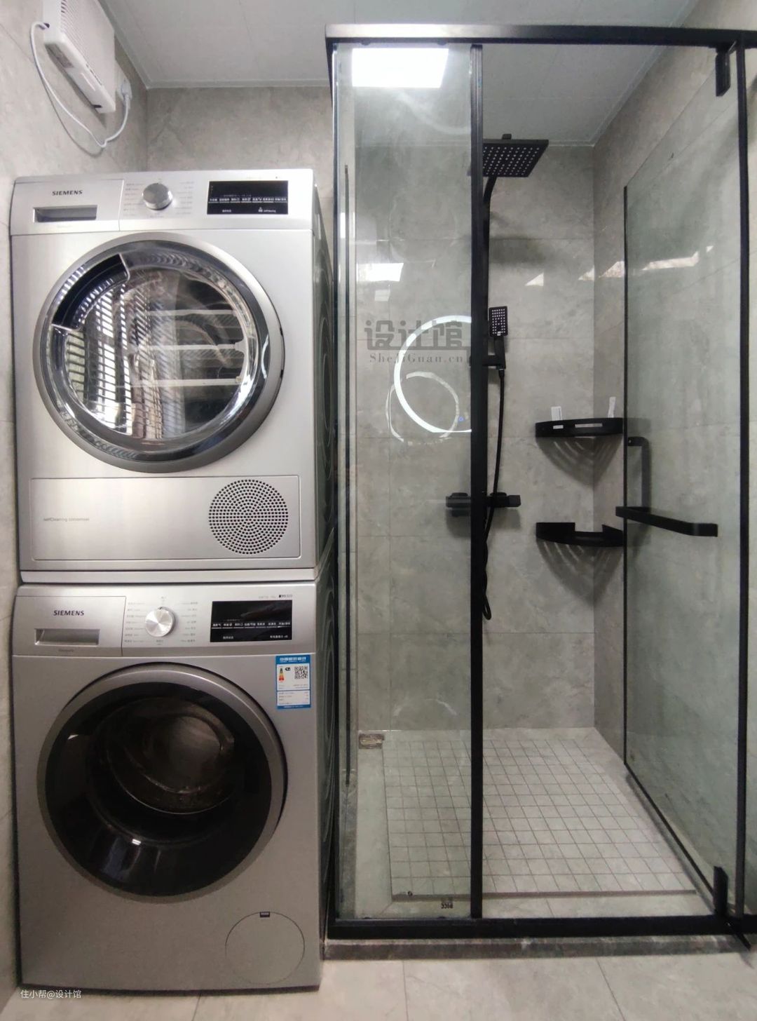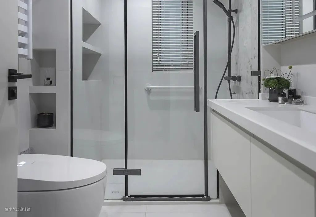 老人家的房子,在容易潮湿的空间的防滑考虑也是很关键,比如卫生间门口放地毯、卫生间地面用哑光防滑砖、淋浴房的地面拉槽防滑,这些细节都是保障父母安全的细节体现。