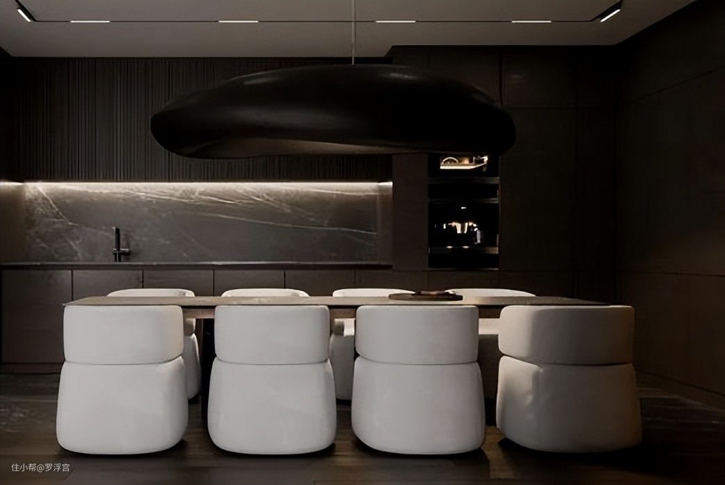 此外,以无主灯设计为基础,添置一盏合适的灯饰,可以让整体空间的实用性和装饰性大大增强。像这个餐桌上方的吊灯也是餐厅设计的一大亮点,具设计感的大面积吊灯不仅与餐厅纯黑色调相得益彰,也让餐桌区域有了补充光源,让就餐更舒适。