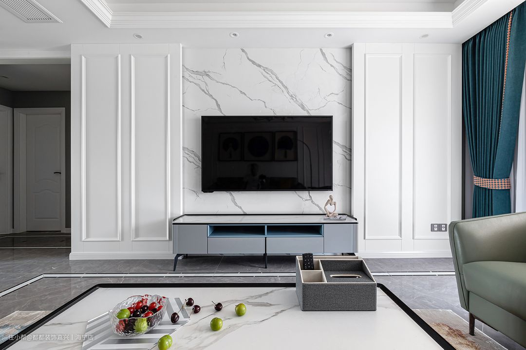 电视墙背景墙采用大理石,纹理自然,简洁大方,勾勒出独特的空间气质,两侧配以对称凸出的石膏线条,让整体墙面造型更显立体轻奢