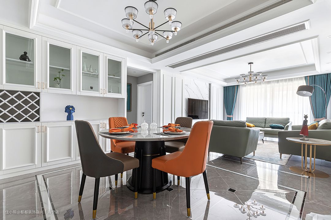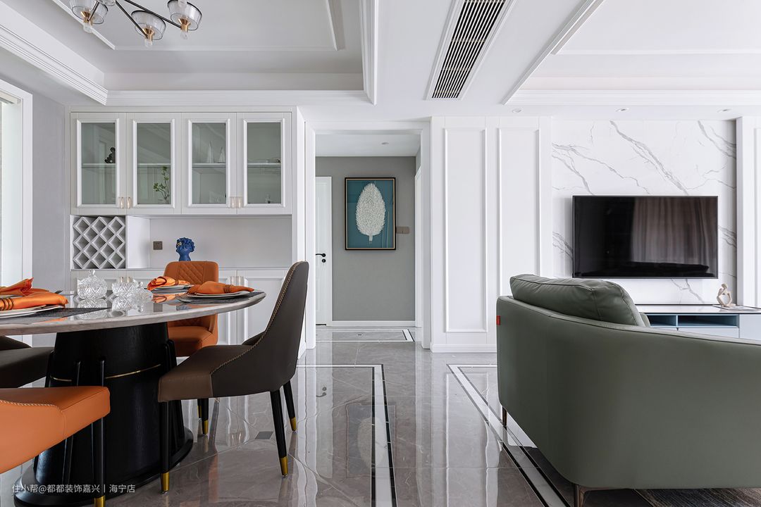 客餐厅一体化,硬装选择了灰白调为基调,为软装的设计释放更大的能量,橄榄绿优雅复古,珊瑚橘暖意温馨,冷暖色调的和谐过渡拉出视觉的层次感,整体空间呈现出自然沉稳而不失高级的气场