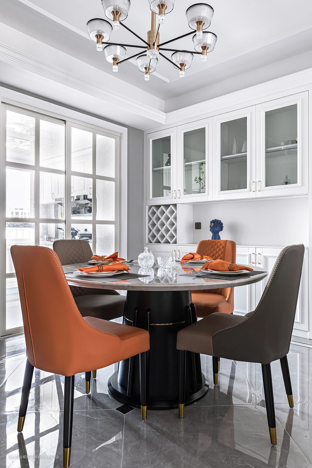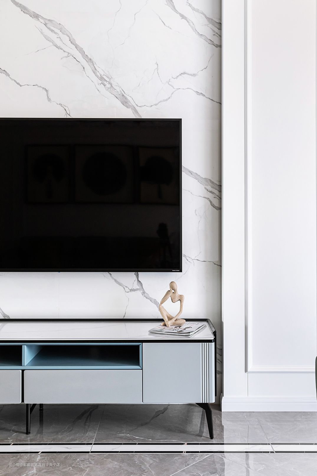 深浅蓝调的储物柜蕴藏着微妙的活力,灰白调的大理石质感不再冰冷,与客厅的调色部分形成呼应,点缀趣味十足的小摆件,传递出一种家的静谧舒适感