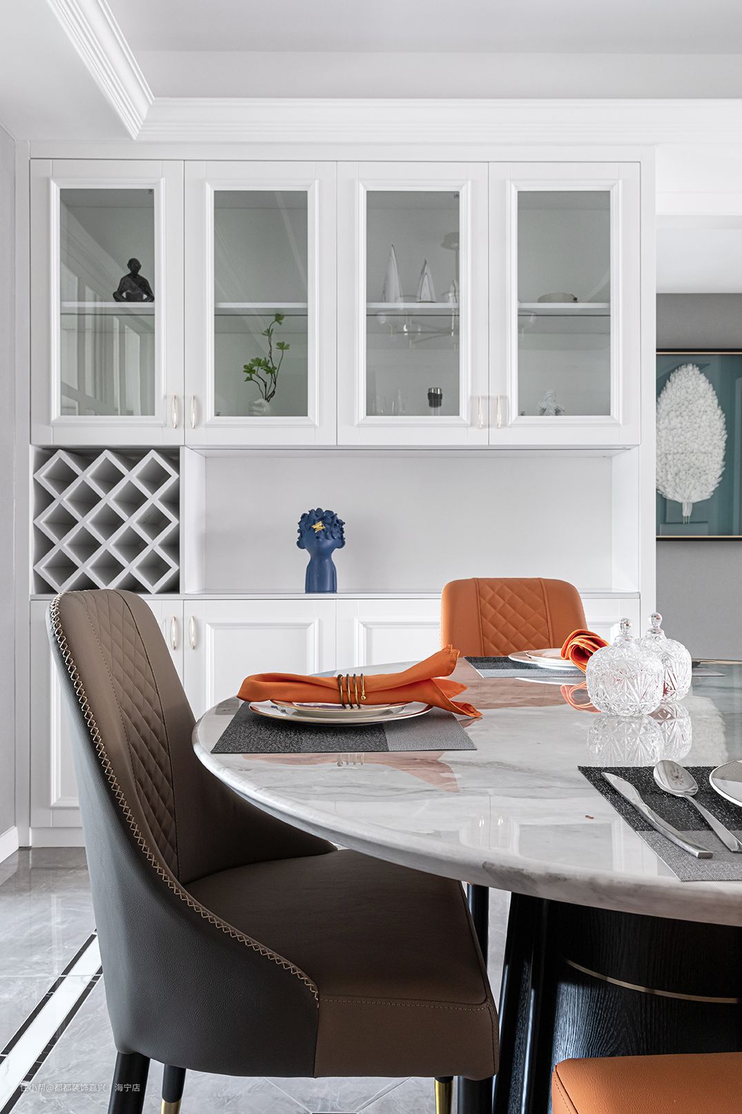 通顶式储物柜有开有合,满足了多样化收纳需求,中间掏空做了隔层,菱形格设计和点缀其上的艺术摆件,为空间注入一丝通透轻盈感