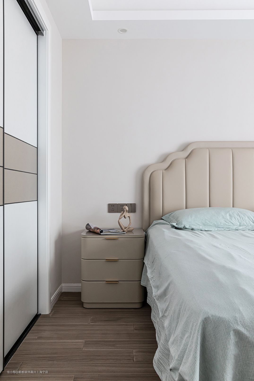 次卧延续了主卧的灰蓝色系,线条简单纯粹的白墙映衬出一室温柔,床头柜上动感十足的精致摆件破开静谧时空,生活气息呼之欲出
