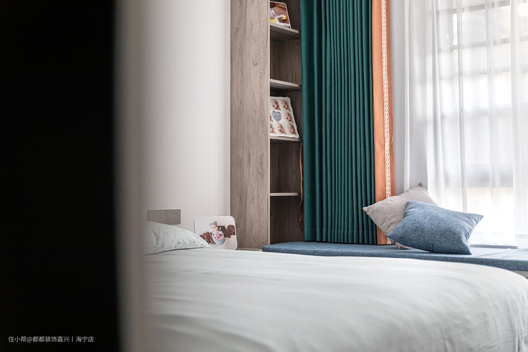 飘窗一侧靠墙做了一个到顶书柜,不管是摆放一些书籍还是具有纪念意义的照片,生活气息十足